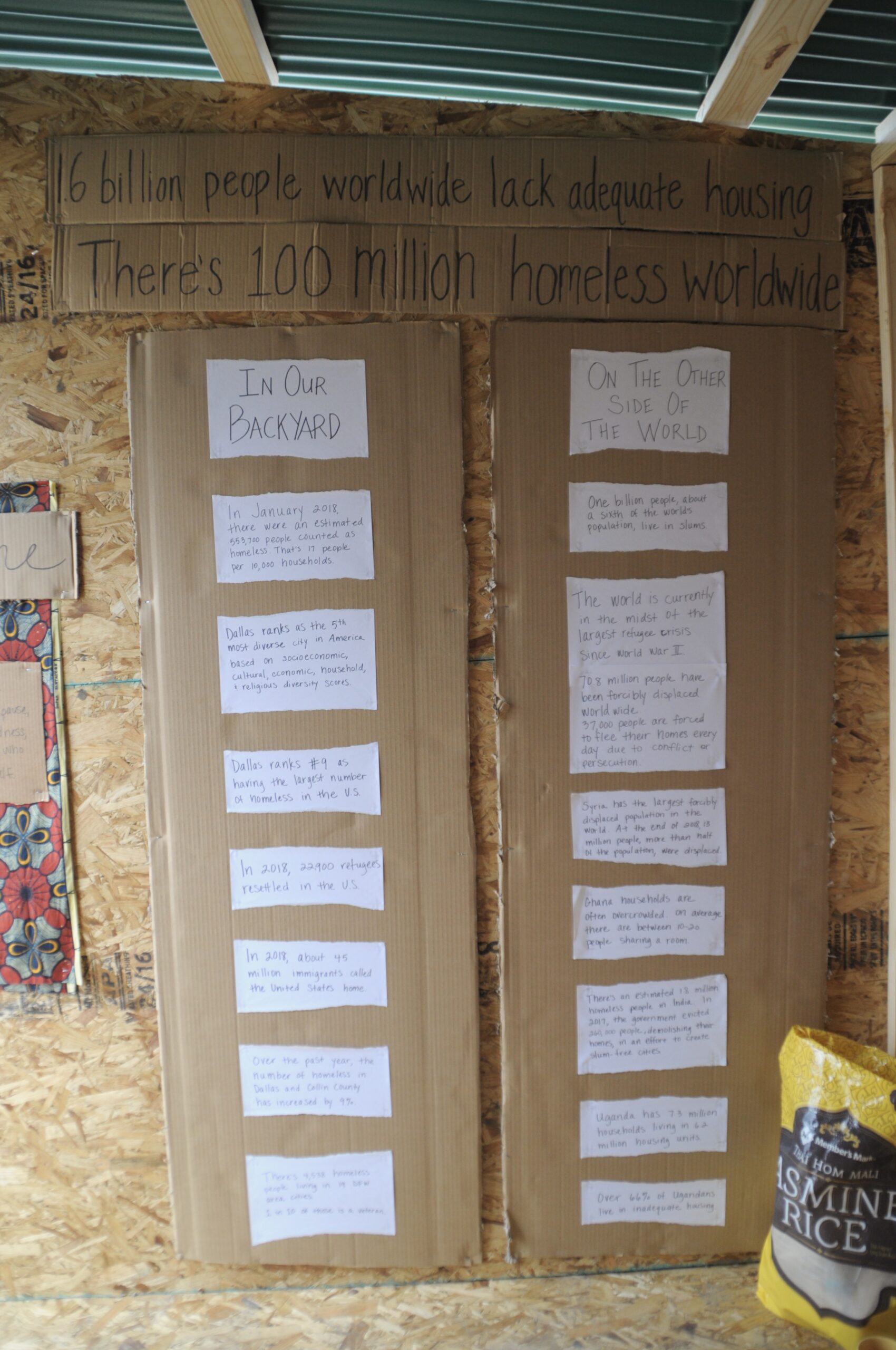 This number seems staggering, which is why we created an Advent Shelter this year in the Dallas metroplex. It’s a simple structure built to resemble the likeness of what a large number of people live in around the world. We have invited people to take a moment from the madness and enter into this space to pause, reflect, and pray for others who might live very differently than themselves. Our hope is that this art installation will give people a tangible experience into their world.